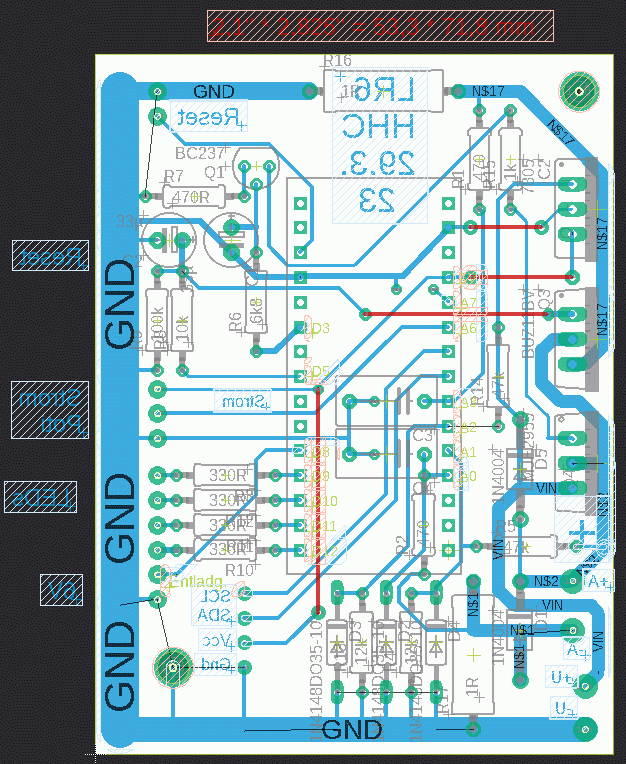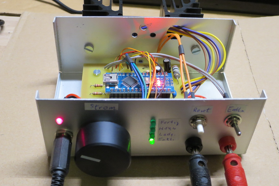 Akku-Laderegler![]() Hier ist ein Bild des Ladereglers Der Kühlkörper muß Wärme abführen können! Links ist die Spannungsversorgung über einen 2,5 mm Hohlstecker. Dazu eignen sich hervorragend Notebook Netzteile mit ihren ca. 20 V Ausgangsspannung und einem Strom um die 2,5 A. Am Drehknopf wird der Strom eingestellt. Die 4 LEDs zeigen den Betriebszustand: Entladen, Laden, Halten 14,4V und Fertig. Rechts sind Reset-Taster und Schalter für Entladung ein/aus. An den beiden Bananenbuchsen hängt der Akku. Hier sind die Bilder von Stromlaufplan und Board. ![]() Dies ist Version LR6 mit Ansteuerung für eine 2-zeilige LCD-Anzeige. Dort werden während der Ladung/Entladung Strom und Spannung angezeigt, danach Spannung und geflossene Ladung. Die Entladung kann übersprungen werden, sie dient vor allem der Ermittlung der Kapazität eines Akkus. Die beiden Strom Mess-Widerstände R16 für Entladung und R17 für Ladung sollen den gleichen Wert haben und beim Maximalstrom 1 V Spannungsabfall verursachen, bei mir ist es je 1 Ohm für 1 Ampere Imax. Kleinere Widerstände ermöglichen höhere Ströme. Dann ist aber die Verlustleistung sowohl in den Widerständen als auch den Leistungshalbleitern zu beachten. Bei 1 A wird der Kühlkörper schon deutlich warm. Ich verwendete Drahtwiderstände im Keramikgehäuse wegen der Temperaturkonstanz. Hier ist das aktuelle Programm Version mit Ansteuerung der LCD-Anzeige. Der Software gibt die Signale sowohl für die LCD-Anzeige als auch die Betriebszustand-LEDs aus. Man kann also Anzeige oder LEDs weglassen. Meine Leiterplatten sind weg. Wer noch eine will, melde sich bei mir. (Stand: 4/2024) |