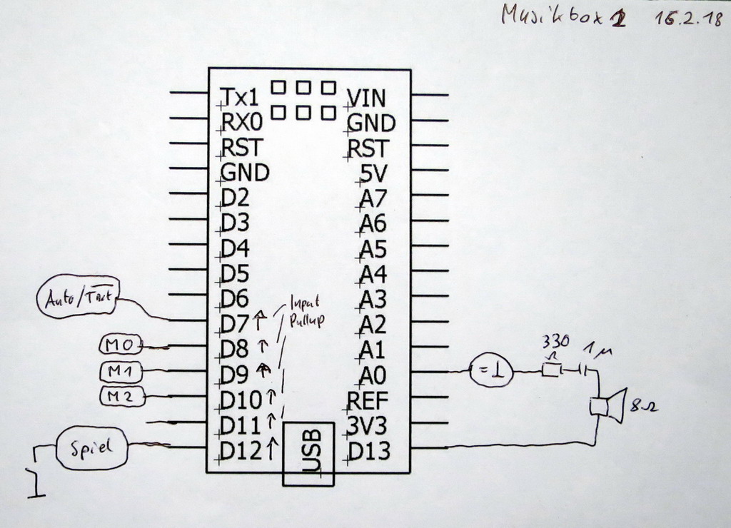 ![]() Hier ist ein Bild des MusikArduinos und seine Beschaltung. Hier wird noch erweitert, insbesondere meine Erkenntnisse zur Umsetzung von Noten in die zugehörigen Töne. Danke dazu an Sebastian, DO5RSW. |